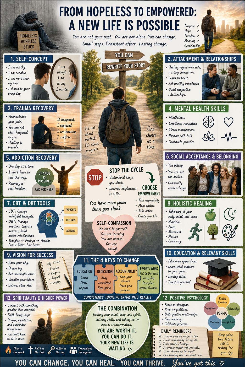 This outreach has 3 audiences in mind—1) the public who needs to see the homeless with more accuracy—less fear—and increased compassion and concern 2) the politicians who only focus on resource-distribution instead of education that changes hearts, minds, and behaviors that are essential for long-term success and 3) the homeless who need to learn life-skills, emotion-regulation, holistic healing, self-compassion through trauma recovery work, 12-step principles (or NA), and embrace strength-based counseling. Additionally, most need to learn how to make & keep goals, develop accountability, manage money, and for some, pro-social skills. *Fear, distrust, and attachment issues go hand-in-hand with homelessness and mental health struggles, and should be considered part of any future program development. This Psychology Today article mirrors my experience on the streets.