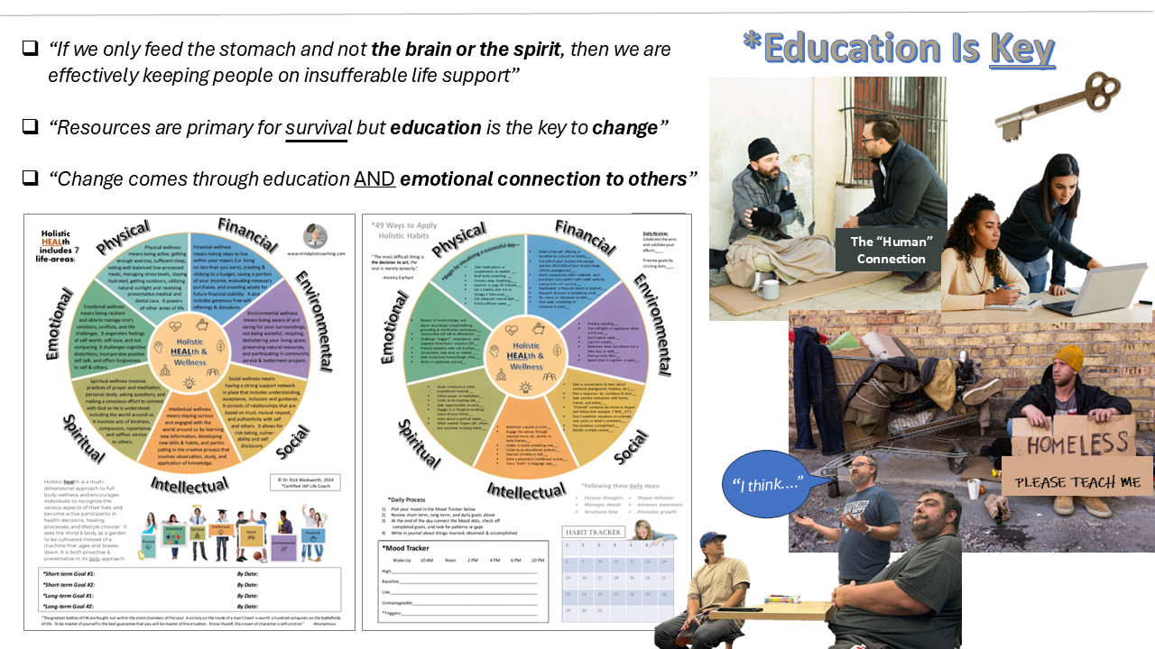 Our lives consist of 8 areas: Physical, Emotional, Spiritual, Intellectual, Social, Environmental, Financial & Occupational. Each area is a separate puzzle piece that interlocks to create a bigger whole. When one area is affected, all areas are affected. Similarly, because all 8 areas of a homeless person’s life have been radically altered, achieving any level of equilibrium is a difficult task but doable if the person wants change enough and willing to apply the principles that lead to it. Hence, education is key.