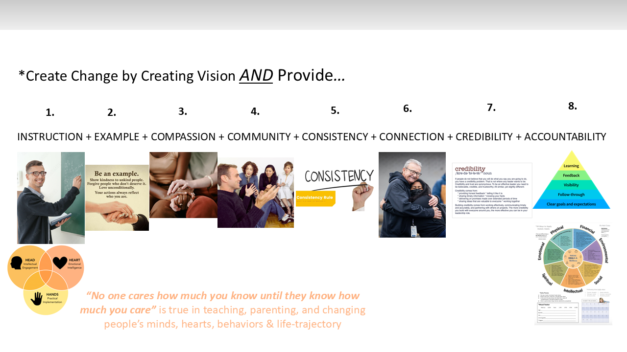 The more one feels loved, connected, heard, understood, and inspired, the more likely they are to listen, retain, and change. Two quotes from top educators teach the importance of connection:
