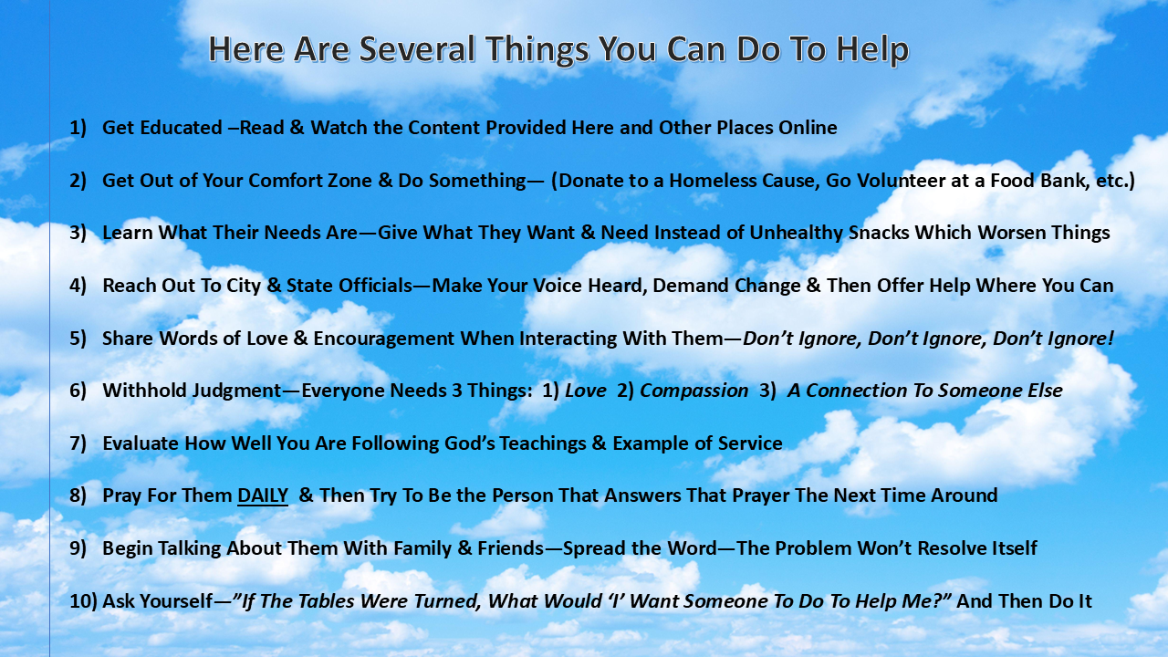 Many people want to help the homeless but don’t know how other than giving food, clothing, snacks, or a few dollars which is important but does not remedy the causes of it, but merely treats the symptoms of it. A correct understanding of the root causes and backstory to their story helps us engage with them in compassionate and meaningful ways. Some are willing to share their story but not until you spend time with them and show them you are sincere in your desire to help by giving them something of value first. *Remember, they are living in a scarcity/hoarding mindset and an unsafe environment where they trust very few people. So let’s dive in…