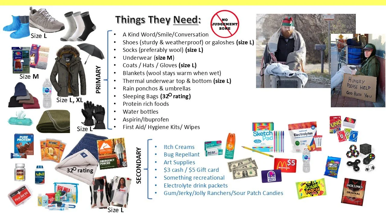 Many people want to help the homeless but don’t know how other than to give food, clothing, or a few dollars on occasion. Here are several things that might be helpful: