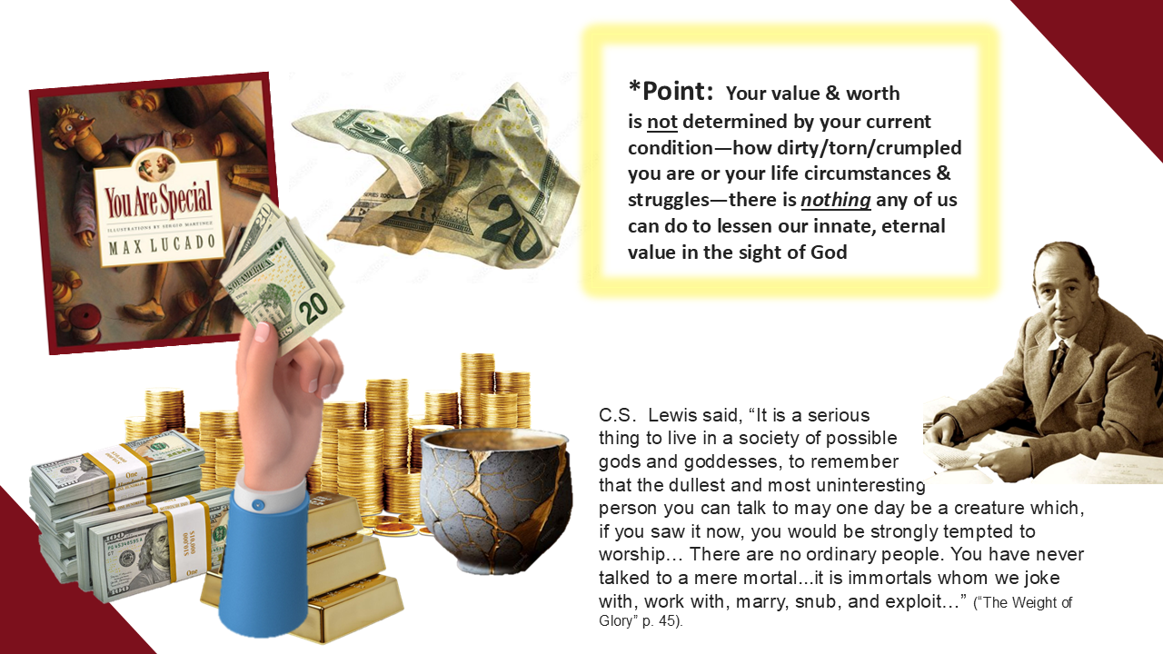 Point: Just as a $20 bill retains its value regardless of its condition, so likewise, your eternal value is NOT determined by your condition in life— if you are crumpled, torn, or dirty from sleeping on the ground, etc.—you have ALWAYS been $20 in God’s eyes and always will be. Never Forget Truth!
