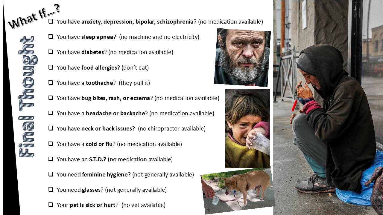It is important to look at life from their perspective to more fully understand their ongoing struggles—they come from a trauma background with significant loss—and then experience trauma regularly through physical, emotional, or sexual abuse; have their stuff constantly stolen, confiscated, or thrown away; are told daily to move by the police (while trying to avoid being arrested for outstanding warrants & fines they couldn’t pay); being denied adequate services (showers, toilets, laundry); always wearing double or triple hand-me-downs; being rejected by their families; unable to stay warm, dry, or cool; always being at the mercy of others to feed & clothe them; panhandling for change; not having access to proper medication or mental health treatment; no consistent communication, transportation, or support network you can rely on; and then trying to figure out where you will sleep the next night. These, and a host of other problems, create a never-ending nightmare that would break most of us.